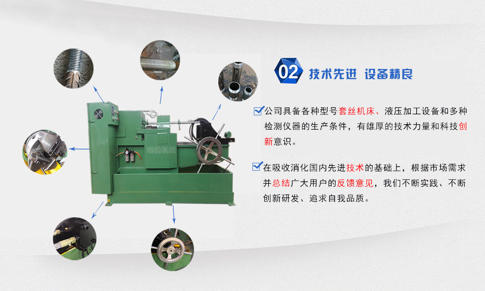 本套絲設(shè)備屬于無削加工設(shè)備,運(yùn)用特殊的切削技術(shù),上絲輕盈快捷,提高生產(chǎn)效率,采用三點(diǎn)一線,同心度高,性能穩(wěn)定等優(yōu)點(diǎn),本機(jī)每分鐘可切削3-5根工件,速度快,效率高,對(duì)于一些不定長(zhǎng)度的鋼結(jié)構(gòu)公司,橋梁工程,電力設(shè)施等大企業(yè)的批量生產(chǎn)之需要。